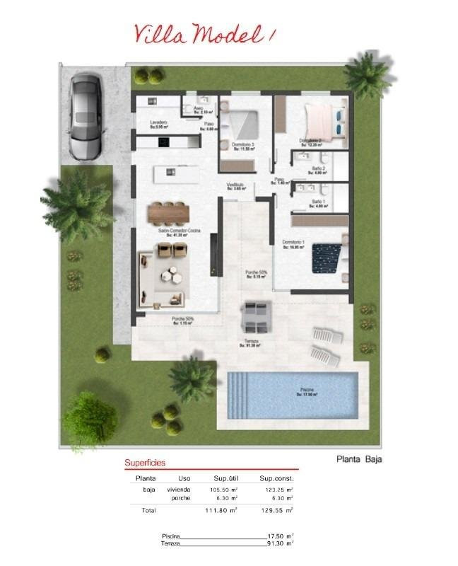 Nybyggede villaer i Altaona Golf Resort i Murcia med privat pool og udsigt til bjergeneModerne villaer i Altaona Golf Resort i MurciaOplev et eksklusivt nybyggeri med moderne villaer beliggende i Altaona Golf Resort, et af de mest attraktive boligområder i Murcia. Omgivet af naturskønne landskaber og bjerge tilbyder dette sikre golfresort et fredeligt miljø, samtidig med at det kun ligger en kort køretur fra byen Murcia og Middelhavskysten.Disse nybyggede villaer er designet til at tilbyde komfort, privatliv og en afslappet middelhavs-livsstil. Projektet tilbyder et udvalg af villaer i ét plan med mulighed for solterrasse eller i to planer, alle med tre soveværelser og to badeværelser, herunder et soveværelse med eget badeværelse.Rummeligt design med private haver og poolHver villa er bygget på en privat grund på mindst 300 m², hvilket giver rigelig udendørs plads til at nyde solen året rundt. Ejendommene omfatter en privat swimmingpool, anlagte haveområder og parkering på grunden.Indretningen er designet til at maksimere det naturlige lys og skabe en sømløs forbindelse mellem indendørs og udendørs ophold. Åbne stue- og spiseområder forbinder direkte til terrassen og poolen, hvilket skaber den perfekte ramme for afslapning eller underholdning af familie og venner.Høj kvalitet og moderne udstyrDisse villaer er bygget med materialer af høj kvalitet og moderne byggeteknikker for at sikre komfort og energieffektivitet. Udstyret omfatter en forstærket sikkerhedsdør, fuldt udstyret køkken med hvidevarer, gulvvarme i badeværelserne og LED-belysning i hele boligen.Yderligere specifikationer omfatter forberedelse til kanalisationsbaseret aircondition og varmtvandsproduktion via et energieffektivt aerotermisk system, hvilket sikrer både bæredygtighed og besparelser.Fremragende beliggenhed tæt på golf, by og kystAltaona Golf Resort er kendt for sin 18-hullers golfbane, fredelige omgivelser og fremragende sikkerhed, hvilket gør det ideelt til både fast bopæl og ferieboliger. Resortet tilbyder en unik kombination af natur, sport og nærhed til vigtige destinationer.Murcias centrum ligger kun 15 km væk og byder på et bredt udvalg af butikker, restauranter, kulturelle attraktioner og serviceydelser. Strandene ved Mar Menor og Middelhavskysten ligger ca. 20 km væk, hvilket er perfekt til at nyde solrige dage ved havet.Andre vigtige afstande omfatter Murcia Corvera Lufthavn 15 km, Cartagena by 35 km og flere golfbaner inden for kort køreafstand, hvilket gør dette til en ideel beliggenhed for golfelskere og internationale købere.Ideel investering og mulighed for middelhavslivDisse nybyggede villaer i Altaona Golf Resort tilbyder en fremragende mulighed for at nyde en livsstil af høj kvalitet i et naturligt og sikkert miljø med nem adgang til både byen og kysten.Kontakt os i dag for mere information eller for at aftale en fremvisning og opdag dit nye hjem i Murcia.